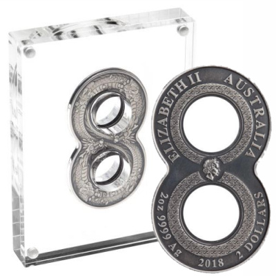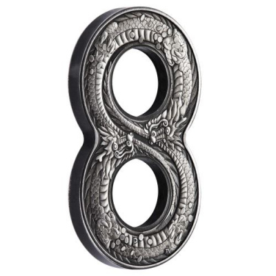 Das Wort für die Zahl Acht klingt im Chinesischen so ähnlich wie das Wort für Glück oder auch Geld. In China hat sie deshalb als Glücksbringer eine sehr große Bedeutung. In den Lunar-Serien, die ja auch von der chineischen Kultur inspiriert sind, taucht die Acht immer wieder in den Auflagen auf. Mit der ersten achtförmigen Silbermünze geht die Perth Mint jetzt noch einen Schritt weiter. Zwei asiatische Drachen mit schlangenähnlichen Leibern ringeln sich um die beiden Kreise, aus denen die Zahl besteht. Auch der Drache steht für Glück, Macht und Wohlstand; noch dazu halten die beiden Fabelwesen Münzen in den Klauen. In der Mitte der Zahl treffen die Köpfe der Drachen zusammen. Auf der Rückseite ist an dieser Stelle das Porträt von Königin Elizabeth II. zu finden.