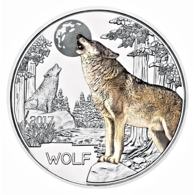 oesterreich-tier-taler-wolf-kupfer-nickel-koloriert-2Dass Wölfe den Vollmond anheulen, ist natürlich nur ein Mythos. Aber das Bild des stolzen Raubtiers vor dem hellen Mond im Hintergrund ist einfach eindrucksvoll. Auf dem neuen Tier-Taler aus Österreich sind gleich zwei heulende Wölfe abgebildet, wobei derjenige im Vordergrund farbig gestaltet ist. Ein urwüchsiger Wald mit Felsen und einer kleinen Lichtung bildet den Hintergrund für die Szene. Beide Tiere haben den Kopf in den Nacken gelegt und senden offenbar ihre lauten Rufe aus. Das Heulen dient zum Beispiel zur Reviermarkierung, aber auch zur Kommunikation mit den Mitgliedern des eigenen Rudels.