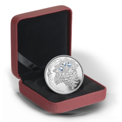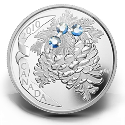 Der uralte Brauch, das Haus zur dunkelsten Zeit des Jahres mit immergrünen Zweigen zu schmücken, war die Inspiration für dieses Münzmotiv. Zwei detailreich gestaltete Kiefernzapfen stehen im Mittelpunkt des Motivs. Am Ansatz findet man zwischen den Kiefernnadeln eine Kette aus drei schimmernden, hellblauen Swarovski-Kristallen. Links schlängelt sich ein Band mit der Aufschrift „Canada“ und dem Prägejahr „2010“ am Rand entlang.