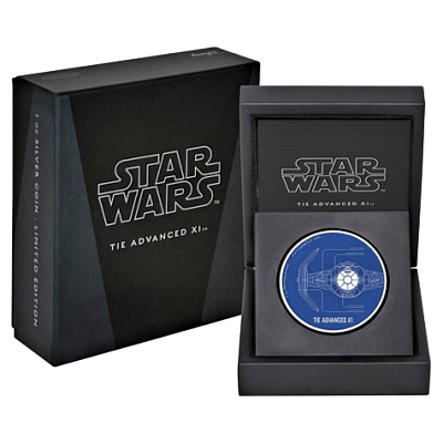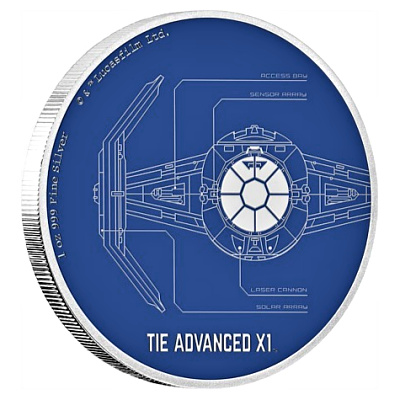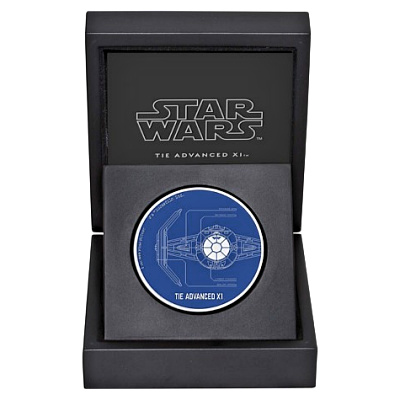 star-wars-ships-TIE-Advanced-X1-1-Oz-Silber-koloriert-3Die in höchster Proof-Qualität geprägte Silbermünze zeigt den Bauplan des TIE Advanced X1 Turbosternjägers als Blaupause. Der Hintergrund der Silbermünze ist blau koloriert, die Linien heben sich in Silber davon ab. Unten ist auch die Bezeichnung TIE Advanced X1 zu lesen. Am Rand sind die Angaben zum Feingewicht von 1 oz und dem Feingehalt (999/1000) verzeichnet, daneben der Hinweis, dass es sich um ein lizenziertes Produkt der Lucasfilm Ltd. handelt. Das Sammlerstück hat einen Durchmesser von 40 Millimetern und einen geriffelten Rand. Die Wertseite zeigt das Rank-Broadley-Porträt von Königin Elizabeth II., darüber das Ausgabeland Niue und rechts der Nennwert von 2 Dollars. Die Münzen sind verpackt in ein Etui und einen schwarzen Shipper mit dem Star-Wars-Schriftzug. Die Auflage ist auf 10.000 Exemplare limitiert.