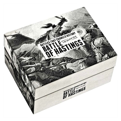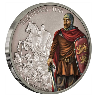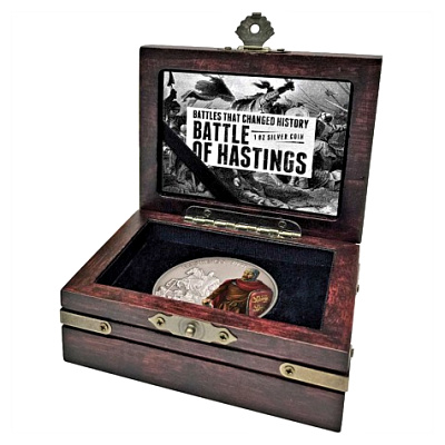 battles-that-changed-history-hastings-1-oz-silber-koloriert-etuiIm Jahr 1066 setzte der normannische Herzog Wilhelm mit seinem Heer über den Kanal, um seinen Anspruch auf die englische Krone durchzusetzen, nachdem  König Edward der Bekenner ohne Nachkommen gestorben war. Quellen berichten, dass Edward, der viele Jahre im Herzogtum Normandie verbracht hatte, Wilhelm zu seinem Nachfolger erklärt hatte. Das nahmen die angelsächsischen Adligen aber nicht einfach hin. Harold II. bestieg den Thron. Doch sein eigener Bruder Tostig stellte Harolds Anspruch in Frage und fiel mit Unterstützung des norwegischen Königs im Norden des Reiches ein. Harold zog ihnen mit seinen Truppen entgegen und errang in der Schlacht bei Stamford Bridge den Sieg. Nur wenige Wochen später legten im Süden die Normannen an. Harold blieb nichts anderes übrig, als nach Sussex zu marschieren und sich Wilhelm zu stellen. Die Schlacht dauerte den ganzen Tag und forderte Tausende von Opfern, darunter auch König Harold.