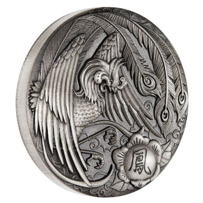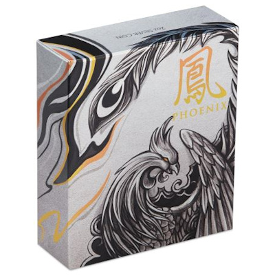 Das randlose Motiv der Silbermünze zeigt den Phönix mit halb ausgebreiteten Flügeln. Die Schwanzfedern, die an einen Pfau erinnern, formen einen Bogen über dem Kopf des Tieres. Im Vordergrund ist eine Blume zu sehen, auf der das chinesische Symbol für den Fenghuang aufgeprägt ist. Die Prägung in High Relief sorgt dafür, dass alle Details des Motivs hervorragend zur Geltung kommen. Das Sammlerstück hat einen Durchmesser von 40,60 Millimetern bei einer Dicke von maximal 6 Millimetern. Der Feingehalt liegt bei 999/1000. Der Münzrand ist geriffelt. Umseitig zeigt die Münze aus 2 oz Feinsilber ein Porträt von Königin Elizabeth II. Der Nennwert beträgt 2 Dollars, Ausgabeland ist Tuvalu. Ausgeliefert wird die Silbermünze im Etui und einem schön gestalteten Shipper. Ein nummeriertes Echtheitszertifikat gehört mit dazu.