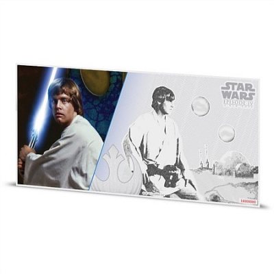 Erst kürzlich erlebte Luke Skywalker in Episode VIII seine Rückkehr auf die Kinoleinwand – deutlich gealtert und verbittert. Die neuen Silberbanknoten der New Zealnd Mint zeigen dagegen noch den jungen, hoffnungsvollen Nachwuchs-Jedi. Ein kolorierter Teil präsentiert Luke mit erhobenem Lichtschwert. Am Übergang zum silbernen Teil ist das Starbird-Logo der Rebellen aufgeprägt, oben in der Ecke findet man auch den Star-Wars-Schriftzug. Unten rechts ist die Nummer der Banknote verzeichnet. Die Auflage ist auf 50.000 Stück limitiert.