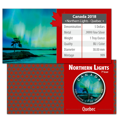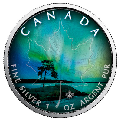 Die Maple Leaf ist eine der beliebtesten Anlagemünzen der Welt. Seit 1988 ist sie auch in Silber erhältlich. Auch Sonderausgaben mit Kolorierung oder Hologramm wurden schon herausgegeben, dazu kommen zahlreiche Editionen mit Privy Marks zu verschiedenen Themen. Zum 30. Geburtstag kommen jetzt die Sondereditionen der Reihe „Northern Lights“ dazu. Das Motiv mit dem Ahornblatt wurde koloriert und zeigt eine Küstenlandschaft mit einem einsamen Baum unter einem weiten Himmel, über den sich die Lichtvorhänge der Aurora ergießen.