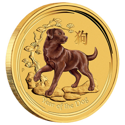 Das Jahr des Hundes beginnt am 16. Februar und folgt auf das Jahr des Hahns. Es ist bereits das elfte der zwölf Tierkreiszeichen. Auch 1922, 1934, 1946, 1958, 1970, 1982, 1994 und 2006 waren „Hundejahre“. Menschen dieser Jahrgänge gelten als freundlich, loyal und gutmütig – ganz wie der Labrador auf der Goldmünze. Er ist seitlich abgebildet und dreht den Kopf, als würde er sich gerade nach seinem Herrchen oder Frauchen umsehen. Aufwendige Farbapplikationen lassen sein Fell seidig glänzen.