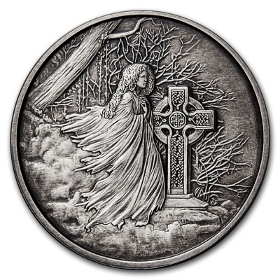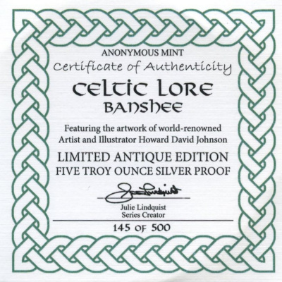 Mit ihren zahlreichen geheimnisvollen Figuren aus der „Anderswelt“ ist die keltische Mythologie eine Fundgrube für Fantasy-Autoren. Der berühmte Zauberer Merlin taucht in unzähligen fiktiven Werken auf. Fast ebenso bekannt ist die Banshee. Deshalb darf sie auch in der Silber-Serie „Keltische Sagen“ der amerikanischen Anonymous Mint nicht fehlen. Das Sammlerstück mit Antik-Finish enthält 5 oz Feinsilber und hat eine limitierte Auflage von nur 500 Stück.