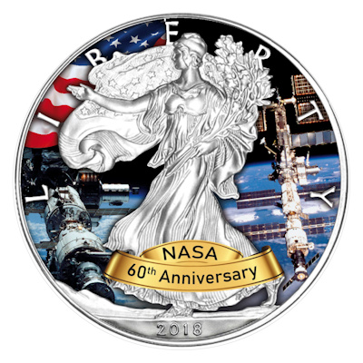 Nach dem Entwurf von Adolph Alexander Weinman zierte die „Walking Liberty“ ursprüngliche die ersten „half-dollars“, die 1916 in Umlauf kamen. Um ihre Schultern weht die Flagge der Vereinigten Staaten. Stolz aufgerichtet, den rechten Arm ausgestreckt, im linken einen Eichen- und einen Olivenzweig haltend, schreitet sie eigentlich der aufgehenden Sonne entgegen. Diese musste hier jedoch Platz machen für die Darstellung der ISS, die den Hintergrund ausfüllt. Wie die NASA feiert auch die Internationale Raumstation 2018 einen runden Geburtstag: Vor 20 Jahren, also 1998, wurden die Verträge unterschrieben und die ersten Module ins All gebracht. In einer Höhe von rund 400 Kilometern umrundet die bemannte Forschungsstation heute alle 90 Minuten einmal die Erde. Unser blauer Planet ist auch dem Motiv der Silbermünze zwischen den Teilen der Raumstation zu sehen. Der mit Farbapplikationen gestaltete Hintergrund zeigt außerdem links noch die Flagge der USA. Ein goldgelbes Banner im Vordergrund trägt die Aufschrift NASA 60th Anniversary.