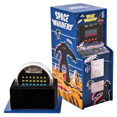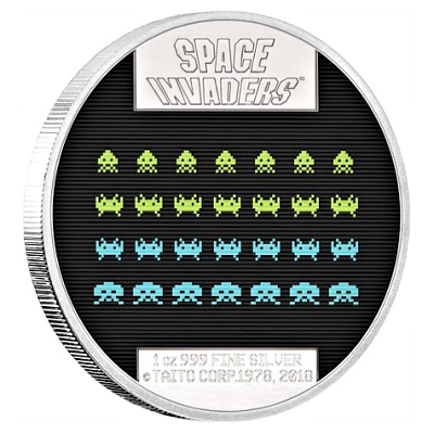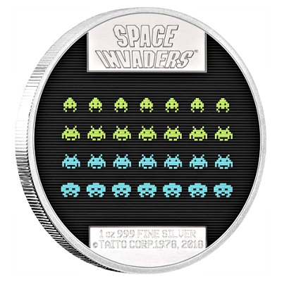 Das Motiv der Silbermünze zeigt die Alienkolonnen, wie Space-Invaders-Veteranen sie kennen. Das Motiv ist als Linsenrasterbild gestaltet, sodass sich die Angreifer je nach Blickwinkel wie im Spiel zu bewegen scheinen. Oben ist das Logo des Spiels auf einem silbernen Feld zu sehen. Unten findet man, ebenfalls auf Silber, das Gewicht von 1 oz und den Feingehalt von 999/1000. Der Münzrand ist geriffelt. Die Wertseite der in höchsters Proof-Qualität geprägten Silbermünze zeigt das Rank-Broadley-Porträt von Königin Elizabeth II. Der Nennwert liegt bei 2 Dollars. Ausgabeland ist Niue. Eine Besonderheit dieses Sammlerstücks ist die Umverpackung: Sie ist wie ein Spielautomat gestaltet. Wenn man den Automaten sozusagen von der Bodenplatte hebt, enthüllt man die gekapselte Münze. Auch das nummerierte Echtheitszertifikat ist in dieser Verpackung untergebracht.