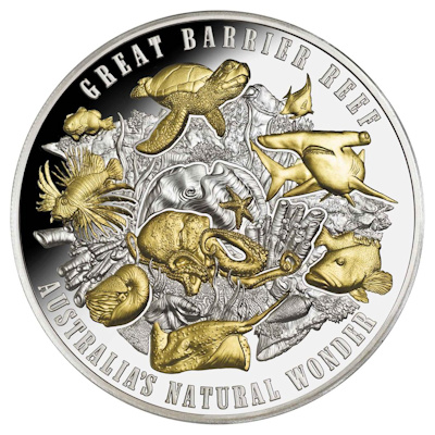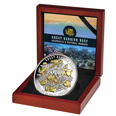 Das Great Barriere Reef gehört zu den Weltnaturwundern der UNESCO. Es setzt sich aus mehr als 2.900 einzelnen Riffen zusammen, die wiederum aus unzähligen winzigen Korallen bestehen. Eine solche Vorlage verlangt natürlich ein besonders detailreiches, fein gezeichnetes Motiv – und diese Silbermünze erweist dem vielfältigen Ökosystem des Korallenriffs alle Ehre. Den Hintergrund bilden die silbernen Korallen mit einer Riesenmuschel in der Mitte. Davor sind einige der faszinierenden Bewohner des Riffs abgebildet, die jeweils aufwendig vergoldet wurden. Eine Suppenschildkröte, ein Hammerhai, ein Segelflosser, ein Seestern, ein Barsch, ein Stachelrochen, ein Rotfeuerfisch und ein Clownfisch sind darunter. Eingerahmt wird das Motiv von dem Schriftzug „Great Barriere Reef Australia’s Natural Wonder“.