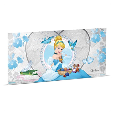 silberbanknote-disney-cinderella-5g-koloriert-3Die silberne Banknote ist in BU-Qualität geprägt und hat die Maße von 150 mal 70 Millimetern. Die Wertseite zeigt das Rank-Broadley-Porträt von Königin Elizabeth II. In der linken oberen und rechten unteren Ecke findet man den Nennwert von 1 Dollar, rechts oben das Gewicht von 5 Gramm (Feingehalt 999/1000). Die untere linke Ecke zeigt das Prägejahr 2018. Das Ausgabeland ist Niue. Die Auflage ist auf 50.000 Exemplare limitiert. Weitere Ausgaben zeigen Belle, Aurora (Dornröschen), Schneewittchen, Rapunzel und Arielle.