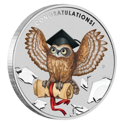 graduation-2018-1-oz-silber-koloriert-2Die Eule ist schon seit den alten Griechen ein Symbol für Weisheit und Klugheit. Sie war ein Attribut der Göttin Athene. Die Designer der Perth Mint stellen die weise Eule in den Mittelpunkt des Motivs. Sie trägt einen bei Abschlusszeremonien im britsichen, amerikanischen und australischen Raum üblichen Doktorhut. Außerdem hält sie eine mit einer roten Schleife verschnürte Schriftrolle, eine Art Diplom, in den Krallen. Das Eulenmotiv ist mit leuchtenden Farbapplikationen gestaltet. Im Hintergrund sind weitere Doktorhüte zu sehen, als hätten die Studenten sie nach der Zeremonie in die Luft geworfen. Oben steht der Schriftzug „Congratulations!“ („Herzlichen Glückwunsch“).