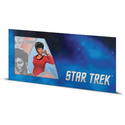 silberbanknote-uhura-5-gramm-silber-3Uhuras Nachname ist von dem Swahili-Wort „uhuru“ abgeleitet, das Freiheit bedeutet. Einen Vornamen bekam die Kommunikationsoffizierin die ganze Serie lang nicht. Dafür gewann Schauspielerin Nichelle Nichols prominente Fans. So soll kein Geringerer als Martin Luther King Jr. sie davon überzeugt haben, nach der ersten Staffel weiterzumachen. Die Silberbanknote zeigt Uhura einmal im Porträt. Daneben ist ein koloriertes Fenster in Form eines Delta Shields abgebildet, in dem die Kommunikationsoffizierin in ihrer roten Unifrom zu sehen ist. Rechts sieht man die Enterprise und den Star-Trek-Schriftzug.