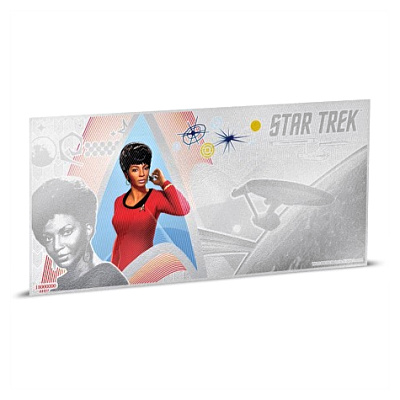 silberbanknote-uhura-5-gramm-silberJetzt kommt Farbe in die Enterprise-Crew! Die neue Ausgabe der Silber-Banknoten-Serie der New Zealand Mint zeigt Lieutenant Uhura. In den 1960ern, als die Originalserie lief, waren afroamerikanischen Frauen im US-Fernsehen noch die Rollen von Hausmädchen und Bediensteten vorbehalten. Mit Uhura änderte sich das. Für viele wurde sie Vorbild und Inspiration. Nach Captain Kirk und Scotty ist ihr jetzt eine eigene Banknote aus 5 g Feinsilber gewidmet.