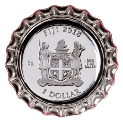 Mit dieser Silbermünze bekommt der Sammler 100 Prozent Coca Cola. „It’s the real thing“ steht auf der Umverpackung – und tatsächlich handelt es sich um ein offiziell lizenziertes Produkt. Der Karton enthüllt eine Dose, die natürlich ebenfalls im Coke-Design gestaltet ist. Darin verpackt findet man das in höchster Proof-Qualität geprägte Sammlerstück, das wie ein Kronkorken aussieht: leuchtend rot koloriert, mit dem typischen Schriftzug und einem umgebogenen Rand. Der Durchmesser beträgt 32,60 Millimeter. Die Münze enthält 6 Gramm Feinsilber bei einem Feingehalt von 999/1000. Die Wertseite – in diesem Fall die Innenseite – zeigt den Nennwert von 1 Dollar und das Ausgabeland Fidschi. Auch das offizielle Staatswappen ist hier zu sehen: ein Schild, der von zwei Kriegern gehalten wird, mit einem Boot darüber und dem Spruchband mit dem Landesmotto darunter.