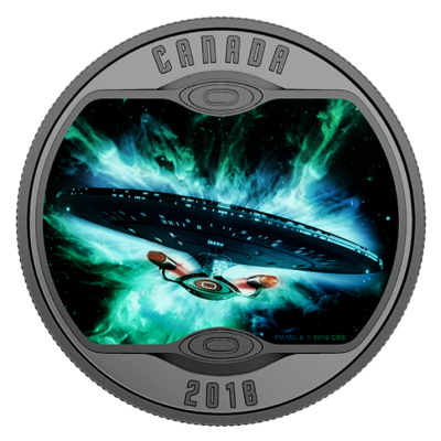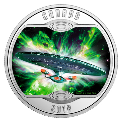 Die Enterprise ist mit Farbapplikationen gestaltet. Der Hintergrund mit einem grünen astronomischen Nebel erzeugt den Eindruck dynamischer Bewegung, der noch verstärkt wird, wenn man die Silbermünze im Dunkeln betrachtet. Das Sammlerstück aus 1/2 oz Feinsilber hat einen Durchmesser von 34 Millimetern und einen Feingehalt von 99,99 Prozent. Der Nennwert liegt bei 10 CAD. Er ist umseitig zusammen mit dem Susanna-Blunt-Porträt von Königin Elizabeth II. zu finden. Der Münzrand ist geriffelt. Die Silbermünze wird gekapselt und in einer Umverpackung im Seriendesign ausgeliefert. Ein nummeriertes Echtheitszertifikat gibt es dazu. Die Auflage beträgt 10.000 Stück.