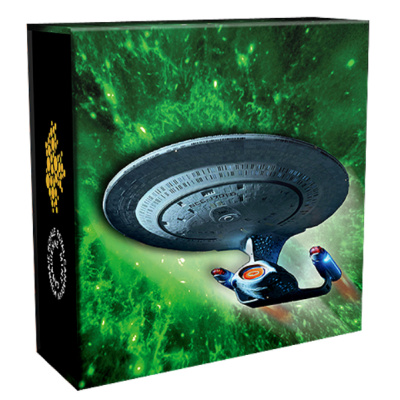 Unter dem Kommando von Captain Jean-Luc Picard machte sich die neue Enterprise vor über 30 Jahren zum ersten Mal auf, um unbekannte Welten zu entdecken. Dabei stieß die Crew immer wieder auf neue Gefahren. Doch zum Glück ist die Enterprise NCC-1701-D auch für diesen Fall hervorragend ausgestattet. Schutzschild, Phaserkanonen und Photonentorpedos machen sie zu einem gefährlichen Gegener, sogar für die Borg. Für einen sicheren Flug durchs All sorgt der Deflektorschild, der kleinere Partikel im Raum und Laserfeuer abhält. Der rot leuchtende Deflektor ist auf dem Münzmotiv gut zu erkennen und findet sich auch im silbernen Rahmen um das kolorierte Bild wieder.