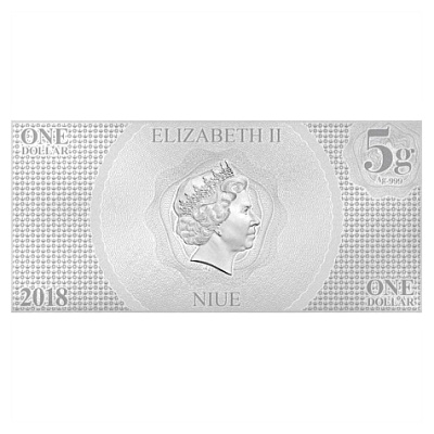 Umseitig zeigt die Silberbanknote das Ian-Rank-Broadley-Porträt von Königin Elizabeth II. Darunter findet man das Ausgabeland Niue. Der Nennwert von einem Dollar ist unten rechts und oben links verzeichnet, das Gewicht von 5 g oben rechts. Der Feingehalt liegt bei 999/1000. Das in Stempelglanz-Qualität geprägte Sammlerstück ist 150 mal 70 Millimeter groß. Die Auflage liegt bei 50.000 Stück. In dem Sammelalbum, das zusammen mit der ersten Ausgabe geliefert wurde, ist auch für Leia eine Seite vorgesehen.