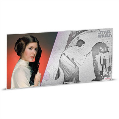 Sie schießt scharf, widersteht Darth Vaders Verhör und sieht einfach toll aus im Bikini: Prinzessin Leia ist alles andere als eine Märchenprinzessin, die auf ihren Prinzen wartet. Ihr Hilferuf an Obi-Wan Kenobi bringt im ersten Star-Wars-Abenteuer die Geschichte in Fahrt. Natürlich bekommt sie auch eine eigene Ausgabe in der Silberbanknotenserie der New Zealand Mint. Das Sammlerstück aus 5 g Feinsilber folgt auf Luke Skywalker, Obi-Wan Kenobi und R2D2 und C-3PO.