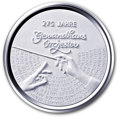 Das Motiv der Silbermünze zeigt die Hände eines Dirigenten. Im Halbkreis, wie die Stuhlreihen in einem Konzertsaal, sind dahinter berühmte Namen der Musikgeschichte verzeichnet – von Mozart über Liszt und Chopin bis hin zu Schumann und Wagner. Sie zeigen nicht nur das Repertoire der Musiker. Bedeutende Komponisten traten in Leipzig auf; weltbekannte Werke feierten ihre Uraufführung.