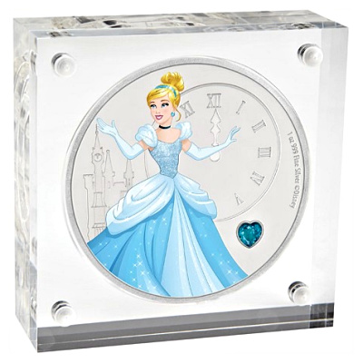 Der silberne Hintergrund zeigt ein Zifferblatt: Es ist genau zwölf Uhr und Cinderella wird sich gleich zurückverwandeln. Daneben sieht man Cinderellas Schloss, für das Schloss Neuwschwanstein als Vorbild diente. Das Sammlerstück enthält 1 oz Feinsilber (Feingehalt 999/1000) und hat einen Durchmesser von 40 Millimetern. Der Münzrand ist geriffelt. Die Wertseite zeigt das Porträt von Königin Elizabeth II. Der Nennwert liegt bei zwei Dollars, als Ausgabeland fungiert Niue. Ausgeliefert wird die Silbermünze in einem Plexiglas-Etui, in dem man sie gut geschützt ausstellen kann. Außerdem gehört ein hübscher hellblauer Shipper dazu. Die Auflage ist auf 10.000 Stück begrenzt.
