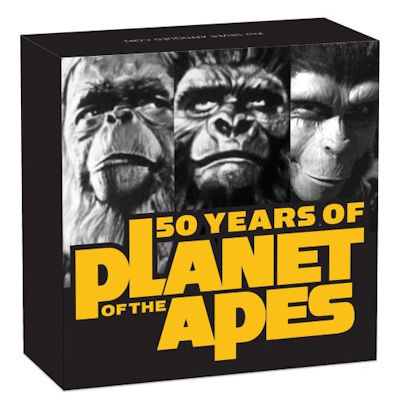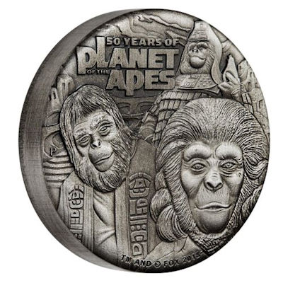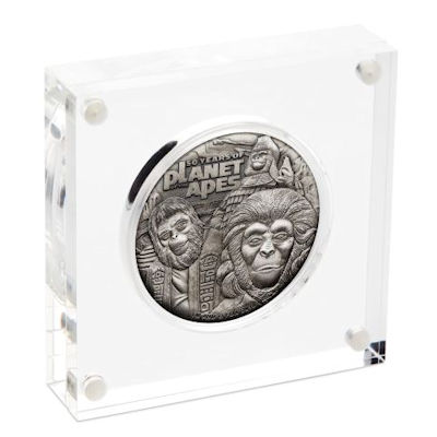 Die Silbermünze zeigt zwei wichtige Figuren des Films: Im Vordergrund ist die „Tierpsychologin“ Dr. Zira zu sehen, die Taylors Intelligenz als erste entdeckt. Daneben ist der Orang-Utan Professor Zaius abgebildet. Im Hintergrund steht ein bewaffneter Gorilla, neben ihm das Filmlogo. Detailreich gestaltet und mit Antik-Finish ist das Motiv eine gelungene Hommage an den Kinoklassiker. Das Sammlerstück enthält 2 oz Feinsilber bei einem Feingehalt von 99,99 Prozent. Es hat einen Durchmesser von 40,60 Millimetern und einen glatten Rand. Die Wertseite zeigt das Porträt von Königin Elizabeth II. umgeben von einem Rahmen, auf dem unter anderem das Ausgabeland Tuvalu und der Nennwert von 2 Dollars verzeichnet sind. Ausgeliefert wird die Silbermünze in einem Präsentationsetui aus Plexiglas und einem Shipper. Bei einer Auflage von nur 2.000 Stück gehört natürlich auch ein nummeriertes Echtheitszertifikat mit dazu. Zum Jubiläum des Filmklassikers hat die Perth Mint außerdem schon eine kolorierte Silbermünze herausgegeben.