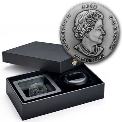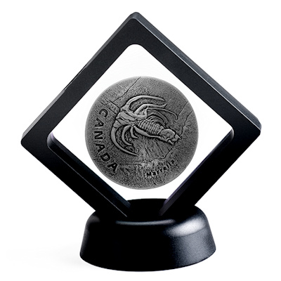ancient-canada-marrella-1-oz-silber-verpackungFür die Silbermünzen dieser Serie benutzt die Royal Canadian Mint ein Gussverfahren, wie es ähnlich schon von den Römern verwendet wurde. So kommt eine leicht unregelmäßige Form ohne Münzrand zustande, die bei jeder Münze etwas unterschiedlich ausfällt. Der Durchmesser beträgt mindestens 38 Millimter. Das per Hand aufgetragene Antik-Finish verleiht dem Sammlerstück zusätzlich eine eindrucksvolle Patina. Eine Lackversiegelung schützt vor Fingerabdrücken, trotzdem sollte die Silbermünze natürlich am besten nicht aus dem Rahmen entfernt werden. Dieser sorgt für eine stilvolle Präsentation. Das Sammlerstück entält 1 oz Feinsilber (Feingehalt 99,99 Prozent). Die Wertseite zeigt das Susanna-Blunt-Porträt von Königin Elizabeth II. und den Nennwert von 20 CAD. Ein nummeriertes Echtheitszertifikat gibt es dazu. Nach Ornithomimus, dem Trilobiten Ogygopsis und Gorgosaurus ist Marrella die vierte Ausgabe der Serie.