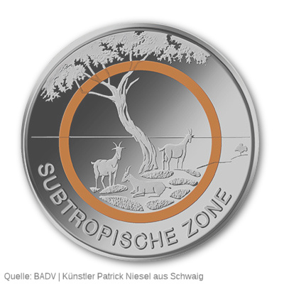 Unter dem Motiv ist, abgetrennt durch den Kunststoffring, die Aufschrift „Subtropische Zone zu lesen. Die Wertseite zeigt den Bundesadler und die zwölf Europasterne. Sie wurde von Stefanie Radtke gestaltet und bleibt bei allen Ausgaben gleich. Der Name der Serie – Klimazonen der Erde – ist in den glatten Münzrand eingraviert. Die Kupfer-Nickel-Münze hat einen Durchmesser von 27,25 Millimetern und wiegt 9 Gramm. In der Serie erscheint jährlich eine Ausgabe. 2017 war die Tropische Zone an der Reihe, 2019 soll die Gemäßigte Zone folgen.