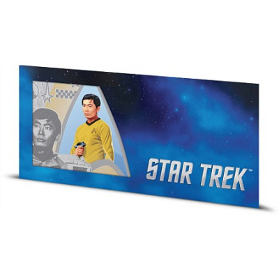 Als Gene Roddenberry das Star-Trek-Universum entwickelte, war die Welt geprägt vom Kalten Krieg und den Erinnerungen an zwei Weltkriege. Umso außergewöhnlicher war die Crew der Enterprise, in der Menschen verschiedener Nationen und Hautfarben als Partner auftraten. Sulu, obwohl offiziell in San Francisco geboren, sollte Asien repräsentieren. Deshalb erhielt er auch seinen fiktiven Nachnamen, der sich nicht direkt einer Nationalität zuordnen ließ. Erst Jahre nach dem Ende der Serie tauchte zum ersten Mal Hikaru als sein Vorname auf. George Takei, der den Astrophysiker und Steuermann mit den vielen verborgenen Talenten verkörperte, ist selbst Amerikaner mit japanischen Vorfahren. Auf dem Motiv der Silberbanknote ist er zweimal zu sehen; einmal in Farbe in einem Fenster in Form eines Delta Shields, und einmal in Silber. Die Enterprise und der Star-Trek-Schriftzug vervollständigen das Bild.