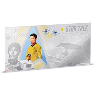 Er hält die Enterprise auf Kurs: Steuermann Lieutenant Hikaru Sulu ziert die neueste Ausgabe der Star-Trek-Silberbanknoten der New Zealand Mint. Gespielt wurde Sulu in der Originalserie von George Takei, dessen Bild – gestaltet mit aufwendigen Farbapplikationen – auch auf dem Sammlerstück zu sehen ist. Nach Captain Kirk, Scotty und Uhura ist diese bereits die vierte Ausgabe der Serie. Wie die Vorgänger passt sie in das Sammelalbum, das mit der ersten Edition erhältlich ist.