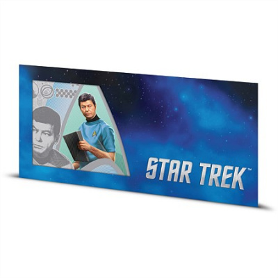 star-trek-silberbanknote-dr-mccoy-koloriert-2Das Sammlerstück hat die Maße von 150 mal 70 Millimetern. Es enthält 5 g Feinsilber bei einem Feingehalt von 999/1000. Auf der Wertseite ist das Ausgabeland Niue unter dem  Rank-Broadley-Porträt von Königin Elizabeth II. zu finden. Der Nennwert von 1 Dollar ist links oben und rechts unten verzeichnet. Die Auflage ist auf 50.000 Stück limitiert.