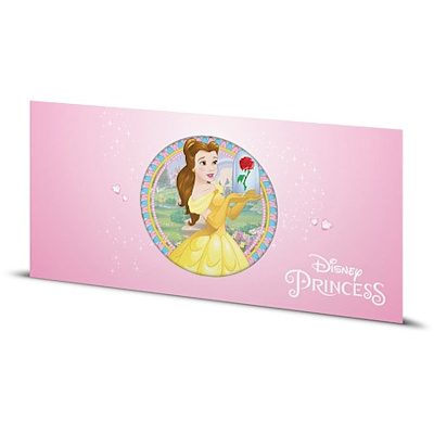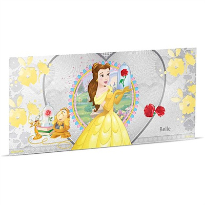disney-prinzessinnen-silber-banknote-belle-3Die kluge Belle, Tochter eines mehr oder weniger erfolglosen Erfinders, ist eine echte Leseratte und weiß deshalb genau, dass man ein Buch nicht nach dem Einband beurteilen darf. Darum ist sie auch genau die Richtige, um über die äußere Erscheinung des Biests hinwegzusehen. Dieses ist eigentlich ein Prinz, der aber wegen seiner Oberflächlichkeit verzaubert wurde – und mit ihm sein ganzes Schloss. Das Personal wurde in Geschirr und Haushaltsgegenstände verwandelt. Der Hofmeister Von Unruh und der Koch Lumière sind auch auf der Silberbanknote zu sehen. In der Mitte steht Belle im goldgelben Ballkleid. Sie hält die verzauberte Rose in der Hand, die anzeigt, wann die Frist, um den Fluch zu beenden, abläuft. Rechts sind zwei weitere rote Rosen abgebildet. Am Rand vervollständigen gelbe Blüten das Motiv.