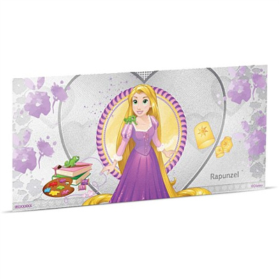 Auf der Silberbanknote ist die Prinzessin eingerahmt von einem Herz abgebildet. Die Blüten im Hintergrund sind passend zu ihrem Kleid in Lila gehalten. Links deuten ein Bücherstapel und eine Farbpalette darauf hin, womit sich Rapunzel in ihrem Turm die Zeit vertreibt; auch ihr Chamäleon Pascal ist hier zu entdecken. Rechts sieht man außerdem die Lampions, die Rapunzel jedes Jahr an ihrem Geburtstag beobachtet – ohne zu ahnen, dass ihre Eltern sie aus genau diesem Anlass aufsteigen lassen. Die Silberbanknote ist ein lizenziertes Disney-Produkt mit einer aufgeprägten Seriennummer, die links unten zu finden ist. Das 150 mal 70 Millimeter große Sammlerstück trägt den Nennwert von 1 Dollar. Die Wertseite zeigt das Rank-Broadley-Porträt von Königin Elizabeth II. über dem Ausgabeland Niue. Die Silberbanknote enthält 5 Gramm Feinsilber. Der Feingehalt liegt bei 999/1000. Die Auflage ist auf 50.000 Exemplare limitiert.