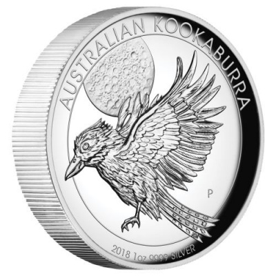 Der Kookaburra trägt den Spitznamen „Buschmanns Uhr“, da sein Ruf vor allem in der Dämmerung zu hören ist: am Morgen, bevor die Sonne aufgeht, oder auch am Abend. Beim Kookaburra 2018 hat sich die Perth Mint sich für eine Darstellung im Flug entschieden. Er ist von der Seite zu sehen und füllt mit seinen weit ausgebreiteten Schwingen einen Großteil der Fläche aus. Über ihm steht ein großer, nah wirkender Vollmond am Himmel, eine Hommage an den „Erntemond“ und die hellen Vollmondnächte am Herbstanfang.