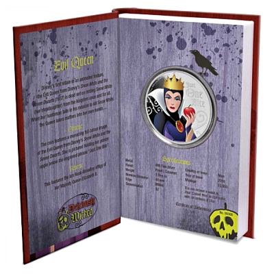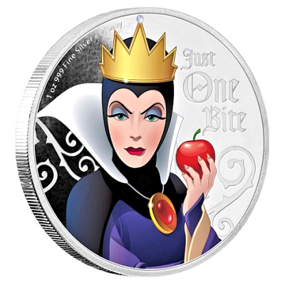 Die Silbermünze zeigt die Königin in ihrer ursprünglichen Gestalt mit dem vergifteten Apfel in der Hand. Sie trägt ein lila Gewand mit hohem weißen Kragen und lila Lidschatten. Die Augenbrauen und die halb gesenkten Lider geben ihrem Gesicht einen hinterhältigen Ausdruck. Rechts stehen in gotischen Lettern die Worte „Just One Bite“. Ornamente ergänzen das Motiv. Oben am Rand findet man die Angaben zum Gewicht von 1 oz und dem Feingehalt von 999/1000. Das in höchster Proof-Qualität geprägte Sammlerstück hat einen Durchmesser von 40 Millimetern und einen geriffelten Rand. Ausgabeland ist Niue. Die Wertseite zeigt das Porträt von Königin Elizabeth II. und den Nennwert von Dollars. Die Auflage ist auf 10.000 Stück limitiert. Sie werden verpackt in ein hübsches Märchenbuch-Etui und mit einem nummerierten Echtheitszertifikat ausgeliefert.