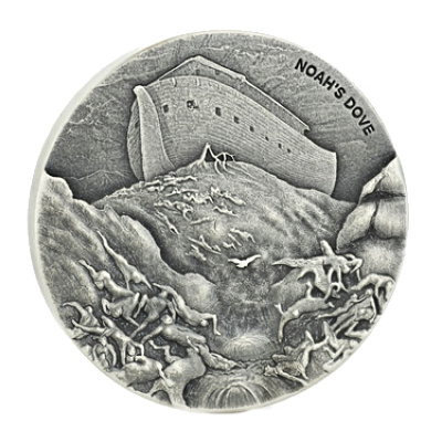 Wieder diente eine Bibelillustration von Gustave Doré als Vorbild für das Motiv der Silbermünze. Sie zeigt eine sehr dürstere Szene: Im Vordergrund sieht man zahlreiche Leichen der Menschen, die Gottes strafende Flut nicht überlebt haben. Oben liegt die Arche Noah auf dem Berg Ararat. Im Mittelpunkt des Bildes steht die Taube, ein kleiner weißer Fleck vor dem düsteren Hintergrund. Sie ist das Symbol der Hoffnung und der Versöhnung Gottes mit den Menschen. „Gegen Abend kam die Taube zu ihm zurück und siehe: In ihrem Schnabel hatte sie einen frischen Ölzweig. Da wusste Noach, dass das Wasser auf der Erde abgenommen hatte.“, heißt es in der Bibel (1. Buch Mose, Kapitel 8, Vers 11).