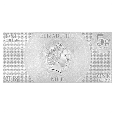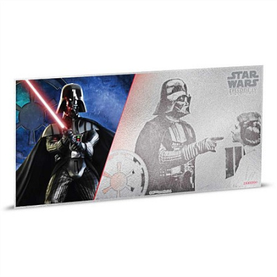 Mit seiner schwarzen Maske und dem gruseligen Atemgeräusch ist Darth Vader einer der eindrucksvollsten Filmbösewichte und ein mächtiger Gegener für Obi-Wan Kenobi und Luke Skywalker – bis er sich zur Überraschung der Fans der ersten Stunde als dessen Vater zu erkennen gibt. Die Silberbanknote zeigt Vader mit erhobenem, rot glühendem Lichtschwert. Dieser Teil des Sammlerstücks ist mit Farbapplikationen gestaltet. Daneben ist der Sith-Lord in Silber zu sehen, wie er Prinzessin Leia bedroht. In der rechten oberen Ecke findet man den Star-Wars-Schriftzug. Rechts unten ist jeweils die Seriennummer der Silberbanknoten verzeichnet.