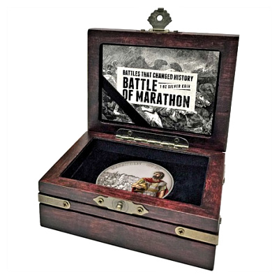 battles-that-changed-history-marathon-1-oz-silber-koloriert-shipperDie Silbermünze zeigt das Schlachtgeschehen: Berittene Perser kämpfen gegen Fußsoldaten aus Athen. Im Vordergrund steht der mit Farbapplikationen gestaltete Heerführer Miltiades. Er hält seinen Helm in der Hand und hat den Blick in die Ferne gerichtet. Oben sind Name und Datum der Schlacht verzeichnet. Die Silbermünze ist in höchster Proof-Qualität geprägt. Sie enthält 1 oz Feinsilber (Feingehalt 999/1000). Der Durchmesser beträgt 40 Millimeter. Der Münzrand ist geriffelt. Die Wertseite zeigt das Porträt von Königin Elizabeth II., den Nennwert von 2 Dollars und das Ausgabeland Niue. Verpackt ist das Sammlerstück in eine Holzschatulle, die auch das nummerierte Echtheitszertifikat enthält. Der dazugehörige Karton zeigt Soldaten im Kampf.