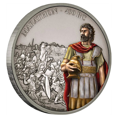 battles-that-changed-history-marathon-1-oz-silber-koloriert-etuiNachdem Athen die ionischen Städte bei einem Aufstand gegen die persische Herrschaft unterstützt hatte, sann der Perserkönig Dareios auf Rache. Er sandte eine Strafexpedition aus, die bei Marathon an Land ging, um von dort vermutlich weiter nach Athen zu ziehen. Den Quellen zufolge standen die Athener einer großen Übermacht gegenüber, als einer ihrer Heerführer – Miltiades – einen mutigen Plan entwickelte: Die zahlenmäßig unterlegenen Athener sollten in vollem Lauf einen Angriff starten und den Gegner damit überrumpeln. Außerdem sollte die Mitte der Angriffslinie geschwächt und dafür die Flanken gestärkt werden, um das persische Heer in die Zange zu nehmen. Vermutlich gehört diese Version der Ereignisse ins Reich der Legenden – ebenso wie die Geschichte des Läufers, der die Siegesnachricht nach Athen brachte. Fest steht aber, dass die Athener einen Sieg gegen die Perser errangen.
