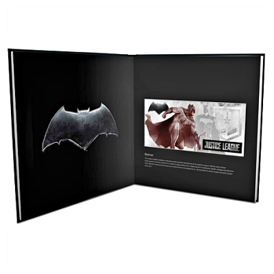 Die Silberbanknote zeigt eine kolorierte Darstellung Batmans mit wehendem Umhang und das bekannte Fledermaussymbol. Auch auf dem silbernen Hintergrund ist Batman zu sehen, neben dem Symbol der Justice League. Das Sammlerstück ist in Stempelglanz-Qualität aus 5 g Feinsilber (Feingehalt 999/1000) geprägt. Es ist 150 mal 70 Millimeter groß. Die Wertseite zeigt in der Mitte das Porträt von Königin Elizabeth II, darunter das Ausgabeland Niue. In der linken oberen und rechten unteren Ecke ist jeweils der Nennwert von 1 Dollar verzeichnet, rechts oben das Gewicht und links unten das Prägejahr. Das passende Album ist schwarz mit dem eindrucksvollen Logo der Justice League auf dem Titel.