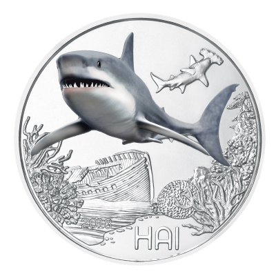 Der Hai auf dem Münzmotiv zeigt seine scharfen Zähne. Er wirkt bedrohlich, aber auch faszinierend. Das gilt vor allem, wenn seine Umrisse im Dunkeln aufleuchten. Im Hintergrund sind Korallen und ein Schiffswrack zu erkennen. Den Nennwert von 3 Euro findet man umseitig. Auf dieser Seite sind scherenschnittartig alle zwölf Tiere der Serie abgebildet. Bereits erschienen sind die Ausgaben Fledermaus, Tiger, Krokodil, Eisvogel, Wolf und Papagei. Die Buntmetallmünze hat einen Durchmesser von 34 Millimetern und ein Gewicht von insgesamt 16 Gramm. Von den Sammlerstücken in der Qualität handgehoben werden 50.000 Exemplare ausgegeben. Auch ein Sammelalbum zur Serie ist erhältlich.