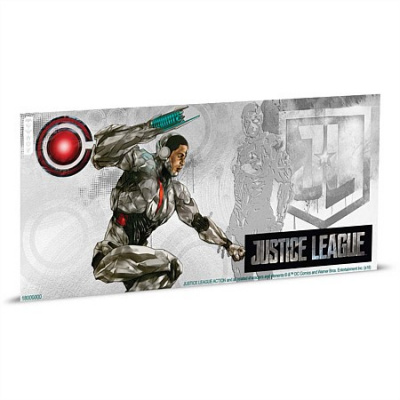 silberbanknote-justice-league-cyborg-2Auf der Silberbanknote ist Cyborg im Vordergrund in Aktion zu sehen. Diese Darstellung ist koloriert, während der Held auf dem silbernen Hintergrund neben dem Symbol der Justice League posiert. Links unten ist die Seriennummer zu finden. Das Sammlerstück ist in Stempelglanz-Qualität geprägt und enthält 5 g Feinsilber (Feingehalt 999/1000). Es ist 150 mal 70 Millimeter groß. Die Wertseite zeigt das Porträt von Königin Elizabeth II. über dem Ausgabeland Niue. In der linken oberen und rechten unteren Ecke ist jeweils der Nennwert von 1 Dollar verzeichnet, rechts oben das Gewicht und links unten das Prägejahr. Mit der Ausgabe Batman wird ein Sammelalbum ausgegeben, in dem auch für Cyborg eine Doppelseite vorgesehen ist.