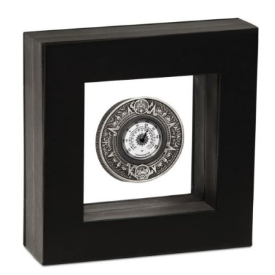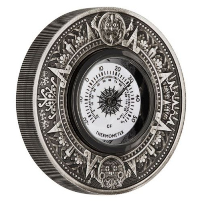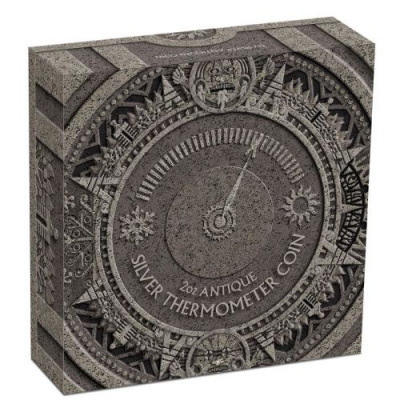 thermometer-2-oz-silber-antik-finish-etuiLetztes Jahr überraschte die Prägeanstalt die Münzsammler mit einer Kompass-Münze, dieses Jahr ist nun das Thermometer an der Reihe. Es bildet den Mittelpunkt der Silbermünze. Hinterlegt mit stilisierten Sonnenstrahlen bewegt sich die Nadel über den Ziffernkranz. Das Design des silbernern Rands ist vom Aztekenkalender inspiriert. Auch zwei aztekische Götter sind zu sehen: der Sonnengott Tonatiuh, dem vermutlich jedes Jahr Tausende von Menschen geopfert wurden, und Itztlacoliuhqui, der Gott des Frosts und des Winters. Durch das Finish in Antikoptik wird der Eindruck noch verstärkt, ein uraltes Fundstück vor sich zu haben.