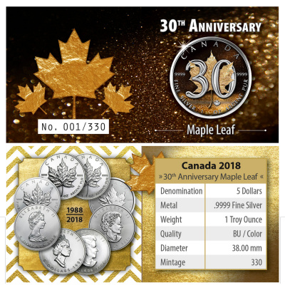 Nur 330 Exemplare gibt die Royal Canadian Mint von dieser Sonderausgabe zum 30. Geburtstag ihres Anlageklassikers, der Maple Leaf, heraus. Eine große 30 dominiert das Motiv. Das namengebende Ahornblatt ist in warmen Goldtönen koloriert. Auch der Hintergrund ist in Gold gehalten, was diesem Sammlerstück gleichzeitig ein edles und leicht herbstliches Aussehen verleiht – schließlich sind Kanadas Ahornwälder nicht zuletzt für das Farbenspiel des „Indian Summer“ bekannt, wenn sich die Blätter von Grün über Gold bis zu leuchtendem Rot verfärben.