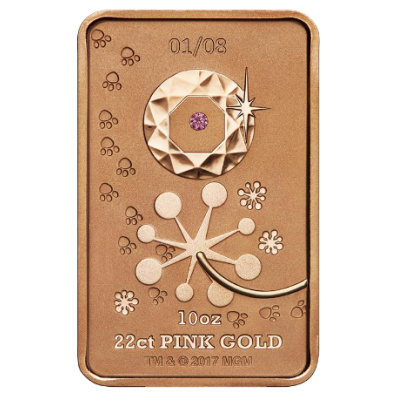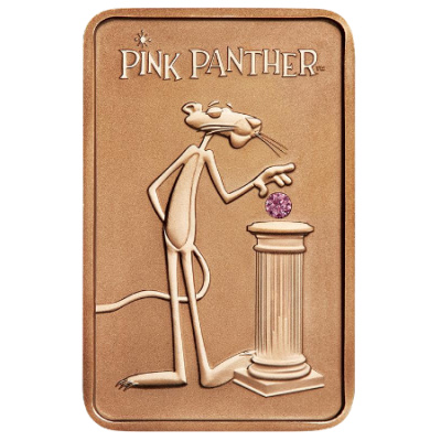 Zigaretten rauchende Zeichentrickhelden? In den 1960ern war das noch kein Problem. Damals passte die Zigarette zur lässigen Eleganz des rosaroten Panthers. Die Figur wurde ursprünglich für den Vorspann des Films „Der rosarote Panther“ entwickelt. Der „Pink Panther“ im Film ist ein besonderer Diamant. Die Zeichentrickfigur kam beim Publikum aber so gut an, dass eine eigene Reihe von Kurzfilmen produziert wurde. Der Goldbarren der Perth Mint bringt den Zeichentrick-Panther wieder mit dem Diamanten zusammen. Die Rückseite zeigt den Panther, wie er ganz nonchalant einen der Edelsteine von einem Sockel nimmt. Es handelt sich dabei um einen Argyle Pink Diamond mit 0,10 – 0,11 Karat. Die Argyle-Diamantmine in Western Australia ist die Hauptquelle für rosa Diamanten weltweit.