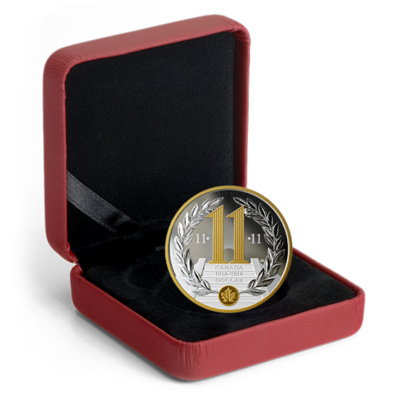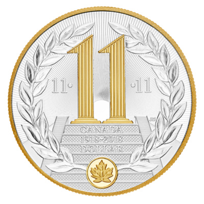 Wie in Großbritannien und anderen Ländern des Commonwealth wird auch in Kanada am 11. November der Remembrance Day gefeiert, der an das Ende des Ersten Weltkriegs erinnert. Die Elf steht auf dem Motiv der Gedenkmünze im Mittelpunkt. Zwei vergoldete Ziffern werden von kleineren silbernen eingerahmt, die für das Datum 11.11. und die Uhrzeit stehen. Die goldenen Einsen erinnern an korinthische Säulen und stehen auf einer Treppe, auf deren Stufen der Name Canada, die Jahreszahlen 1918-2018 und die Währungsangabe Dollar zu lesen sind. Die Gesamtkomposition erinnert an das Canadian National Vimy Memorial, eine Gedenkstätte für die in der Schlacht von Arras gefallenen Soldaten. Eingerahmt wird dieses Bild von einem Lorbeerkranz als Zeichen des Friedens. In der Mitte des Kranzes prangt ein goldenes Ahornblatt.