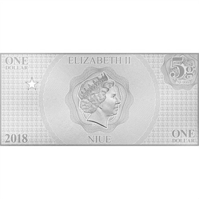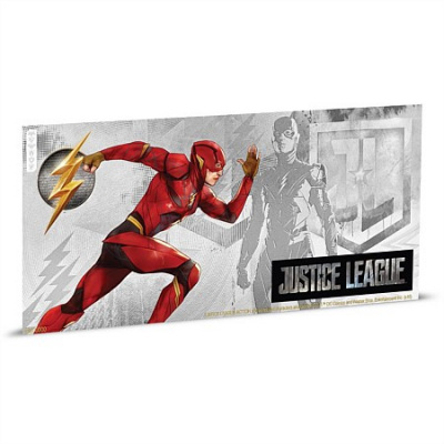 Über dem kolorierten Flash sieht man links das Symbol des Superhelden, einen Kreis mit einem Blitz. Daneben ist er auch noch in Silber zusammen mit dem Justice-League-Logo abgebildet. Die Silberbanknote aus 5 g Feinsilber (Feingehalt 999/1000) ist 150 mal 70 Millimeter groß. Sie trägt den Nennwert von einem Dollar. Das Ausgabeland Niue ist auf der Wertseite unter dem Porträt von Königin Elizabeth II. zu finden. Neben dem Nennwert sind auf dieser Seite auch noch rechts oben das Gewicht und links unten das Prägejahr verzeichnet. Das Sammlerstück ist in Stempelglanz-Qualität geprägt und hat einen Platz in dem zur Serie pasenden Sammelalbum, das Münzsammler zusammen mit der Ausgabe Batman erhalten.