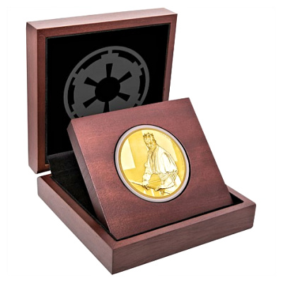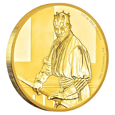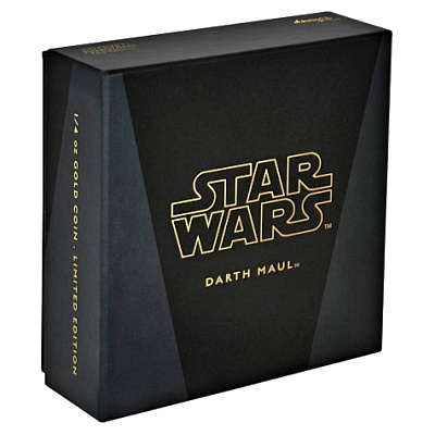 star-wars-darth-maul-gold-shipperDie Goldmünze zeigt den teuflischen Darth Maul in Kampfhaltung. Am Rand ist vermerkt, dass es sich um ein lizenziertes Produkt der Lucasfilm Ltd. handelt. Darüber findet man die Angaben zum Gewicht und zum Feingehalt von 99,99 Prozent. Die Goldmünze aus 1/4 oz Gold hat einen Durchmesser von 23 Millimetern. Bei der Münze aus 1 oz Feingold beträgt er 32 Millimeter. Beide haben einen geriffelten Rand und sind in höchster Proof-Qualität geprägt. Die Wertseite zeigt das Porträt von Königin Elizabeth II. Der Nennwert liegt bei der Goldmünze aus 1 oz Feingold bei 250 Dollars. Die kleinere Version trägt den Nennwert von 25 Dollars. Die Sammlerstücke werden mit nummeriertem Echtheitszertifikat und verpackt in ein stilvolles Holzetui ausgegeben.
