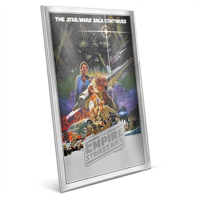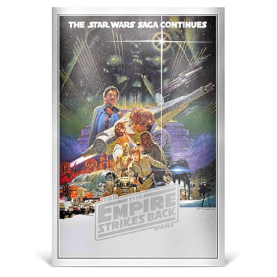 star-wars-poster-empire-strikes-back-silber-koloriert-3Alle Hauptfiguren des Films sind auf dem Plakat versammelt: Luke Skywalker im Vordergrund, neben ihm der treue R2-D2, dahinter C-3PO und Chewbacca, Han Solo mit Leia, Lando und schließlich Darth Vader als dunkle Bedrohung im Hintergrund. Damit sich das in BU-Qualität geprägte Sammlerstück gut präsentieren lässt, ist es in einen Acrylrahmen verpackt. Umseitig hat es, wie eine Sammlermünze, eine Wertseite. Sie zeigt das Rank-Broadley-Porträt von Königin Elizabeth II., das Ausgabeland Niue und den Nennwert von 2 Neuseeland-Dollars. Der Feingehalt liegt bei 999/1000. Die Auflage ist auf 10.000 Exemplare limitiert. Verpackt ist die Silberfolie in einen Umschlag, auf den das Echtheitszertifikat aufgedruckt ist.