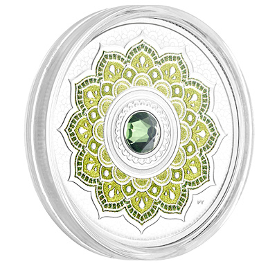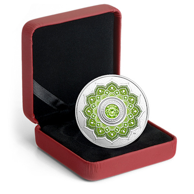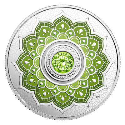 birthstone-2018-august-silber-kristall-3Der Kristall steht im Mittelpunkt des mandala-ähnlichen Motivs. Eine stilisierte Lotosblüte bildet den Hintergrund, wobei die zwölf Blütenblätter für die zwölf Monate des Jahres stehen. Ein silberner Rahmen hebt den farbigen Kristall von der kolorierten Blüte ab. Die Silbermünze hat einen Durchmesser von 27 Millimetern und enthält 1/4 oz Feinsilber (Feingehalt 99,99 Prozent). Der Münzrand ist geriffelt. Die Wertseite zeigt das Susanna-Blunt-Porträt von Königin Elizabeth II. und den Nennwert 5 CAD. Das Sammlerstück ist in höchster Proof-Qualität geprägt. Gekapselt, im Etui und mit nummeriertem Echtheitszertifikat kommt es zum Sammler – eine ideale Geschenkidee für Numismatik-Fans, die im August Geburtstag feiern.