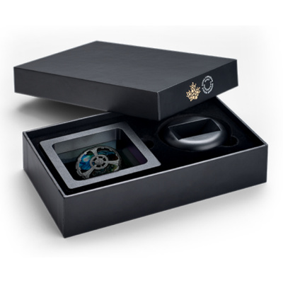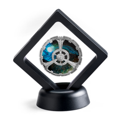 25-jahre-star-trek-deep-space-nine-1-oz-silber-koloriert-verpackungFür diese Jubiläums-Sammleredition wurde die Form der Silbermünze an die Raumstation angepasst. Der Andockring bestimmt den Randverlauf. Der runde Mittelteil bietet umseitig Platz für das Porträt von Königin Elizabeth II., während der Blick durch die Station ins All auf beiden Seiten mittels Farbapplikationen dargestellt ist. Das Revers zeigt den Bajoranischen Sektor inklusive des Wurmlochs links oben. Der Durchmesser liegt bei 36,15 Millimetern. Der Feingehalt beträgt 99,99 Prozent. Der Rand ist glatt. Der Nennwert beträgt 20 CAD. Die Silbermünze wird in einem Plexiglasetui ausgeliefert. Dazu gibt es einen Ständer, sodass sich die Münze perfekt präsentieren lässt. Das nummerierte Echtheitszertifikat darf bei der limitierten Auflage natürlich nicht fehlen.